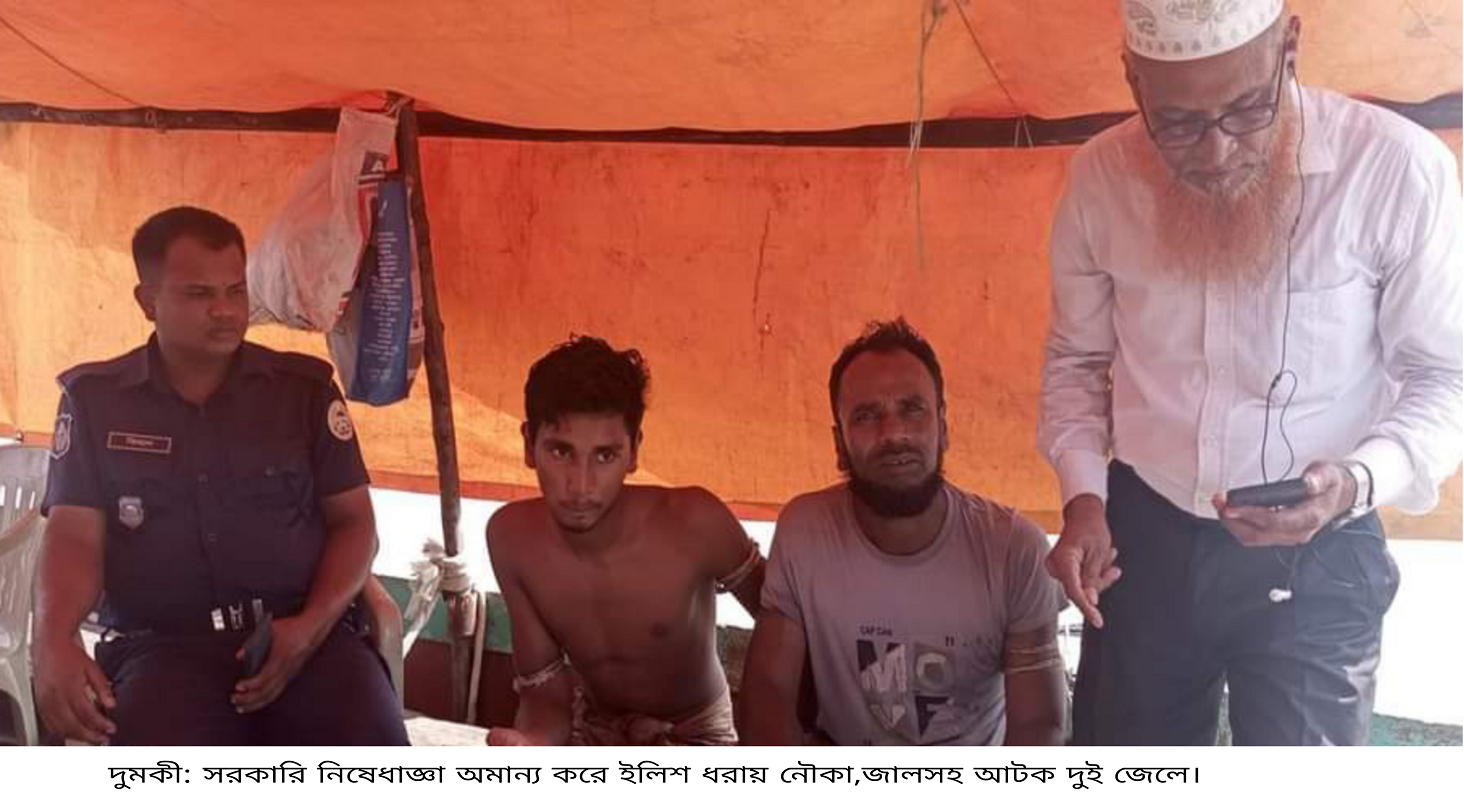 রবিবার (২২অক্টোবর) বেলা ১১টার দিকে উপজেলার পাতাবুনিয়া ফেরি ঘাট এলাকার পায়রা নদীতে সরকারি নিষেধাজ্ঞা অমান্য করে সাইন জাল ফেলে অবৈধ ভাবে ইলিশ ধরার সময় মৎস্য কর্মকর্তা মোঃ নুরুল ইসলামের নেতৃত্বে দুমকী থানা পুলিশের সহায়তায় উক্ত দুই ব্যক্তিকে নৌকা ও জালসহ আটক করে। পরে বিকাল ৫টার দিকে দুমকী উপজেলা নির্বাহী অফিসার ও নির্বাহী ম্যাজিস্ট্রেট মোঃ আল ইমরান আটককৃত মোঃ সাইদুল মৃধাকে ১মাস জেল ও মোঃ মাইনুল ইসলামকে ৫হাজার টাকা জরিমানা করেন ।