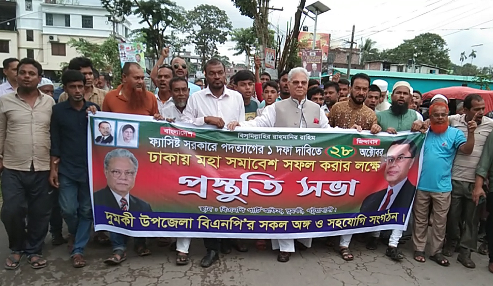 দুমকী প্রতিনিধিঃ বাংলাদেশ জাতীয়তাবাদী দল (বিএনপি’র) কেন্দ্র ঘোষিত আগামী ২৮ অক্টোবর ঢাকায় অনুষ্ঠিতব্য মহা সমাবেশকে সফল করতে দুমকীতে বিএনপির প্রস্তুতি সভা অনুষ্ঠিত হয়েছে। ২৪ অক্টোবর বেলা ১২.০০ টায় উপজেলা বিএনপির সাবেক যুগ্ম আহবায়ক ও বর্তমান কমিটির অন্যতম সদস্য মোঃ জসিম উদ্দিন হাওলাদারের সভাপতিত্বে উপজেলা বিএনপি কার্যালয়ে এ প্রস্তুতি সভা অনুষ্ঠিত হয়। উপজেলা বিএনপির সাবেক যুগ্ম সাধারণ সম্পাদক ও বর্তমান সদস্য মতিউর রহমান দিপুর সঞ্চালনায় প্রধান অতিথি হিসেবে উপস্থিত ছিলেন বিএনপি কেন্দ্রীয় নির্বাহী কমিটির অন্যতম ভাইস চেয়ারম্যান সাবেক স্বরাষ্ট্র ও বানিজ্য মন্ত্রী এয়ার ভাইস মার্শাল (অবঃ) আলহাজ্ব আলতাফ হোসেন চৌধুরী। প্রধান অতিথির বক্তব্যে তিনি বলেন, বর্তমান সরকারের যে সকল নেতারা দেশের টাকা চুরি করে বিদেশে পাচার করেছে প্রতিটি টাকা দেশের জনগণকে ফেরৎ দিতে হবে। তিনি আরও বলেন, বিএনপি সমাবেশ ডাকলেই এই অবৈধ সরকার ভীত হয়ে বাস, লঞ্চ, ট্রেনসহ সকল যোগাযোগ ব্যবস্থা বন্ধ করে দেয়। এ সময় উপস্থিত ছিলেন উপজেলা বিএনপির সদস্য আনোয়ার হোসেন ফরাজি, ফোরকান আহম্মেদ, সোলাইমান বাদশা, জেলা ছাত্রদলের সাবেক নেতা এ্যাড.আনিসুর রহমান, উপজেলা যুবদলের সদস্য সচিব রিপন শরীফ প্রমূখ। সভা শেষে বিএনপি কার্যালয় থেকে বের হয়ে লেবুখালি-বগা মহা সড়কের জনতা কলেজের দক্ষিন পাশের্বর সড়কে এক দফা এক দাবিতে মিছিল অনুষ্ঠিত হয়। এসময় উপজেলা বিএনপি,যুবদল, কৃষকদল, শ্রমিকদল, মৎসজীবিদল, ছাত্রদলসহ বিভিন্ন অংগ সংগঠনের নেতাকর্মীরা উপস্থিত ছিলেন।