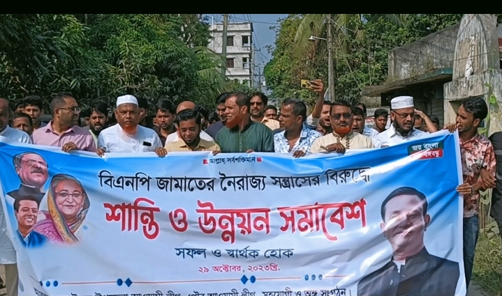 বাউফল প্রতিনিধি: কেন্দ্রীয় নির্দেশনা মেনে বিএনপি জামাতের নৈরাজ্যর প্রতিবাদে পটুয়াখালীর বাউফল পৌর শহরে হুশিয়ারি মিছিল এবং শান্তি ও উন্নয়ন সমাবেশ অনুষ্ঠিত হয়েছে। রবিবার (২৯ অক্টোবর) সকাল ১১টায় বাউফল প্রেসক্লাব রোডস্থ দলীয় কার্যালয়ে উপজেলা আওয়ামী লীগ ও সহযোগী সংগঠনের নেতা-কর্মীরা এই সমাবেশের আয়োজন করেন। এরআগে বিএনপি জামাতের বিরুদ্ধে একটি হুশিয়ারি মিছিল করে তারা। মিছিলটি দলীয় কার্যালয় থেকে শুরু হয়ে শহরের প্রধান সড়ক প্রদক্ষিন শেষে একই স্থানে গিয়ে শেষ হয়।