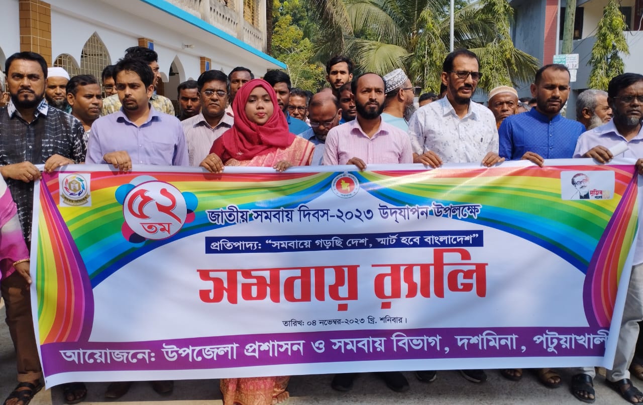 দশমিনা প্রতিনিধিঃ একই প্রতিপাদ্যকে সামনে রেখে পটুয়াখালীর দশমিনায় ৫২তম জাতীয় সমবায় দিবস পালন করা হয়েছে। দশমিনা উপজেলা প্রশাসন ও সমবায়ের যৌথ আয়োজনে দিবসটি পালন উপলক্ষে জাতীয় এবং সমবায় পতাকা উত্তোলন, বর্ণাঢ্য র্যালি, পবিত্র কোরআন থেকে তালোয়াত ও পবিত্র গীতা থেকে পাঠ শেষে আলোচনা সভা ও সফল সমবায় সমিতি এবং সমবায়ী উদ্যোক্তাদের নিয়ে আলোচনা করা হয়। উপজেলা পরিষদ হলরুমে উপজেলা নির্বাহী অফিসার নাফিজা নাজ নীরা’র সভাপতিত্বে ও চরহোসনাবাদ কো-অপারেটিভ ক্রেডিট ইউনিয়নের সভাপতি পি.এম রায়হান বাদল এর সঞ্চালনায় প্রধান অতিথি ছিলেন দশমিনা উপজেলা পরিষদের চেয়ারম্যান আব্দুল আজীজ। বিশেষ অতিথি হিসেবে উপস্থিত ছিলেন, সহকারী কমিশনার (ভূমি) ওসিউজ্জামান চোধুরী, উপজেলা পরিষদের মহিলা ভাইস চেয়ারম্যান সামছুন্নাহার খান ডলি, পটুয়াখালী জেলা সমবায় কার্যালয়ের পরিদর্ষক মো. ইমরান হোসেন, উপজেলা মৎস্য ফিসারিস অফিসার মো. নাজমুল হাসান, গছানী কো-অপারেটিভ ক্রেডিট ইউনিয়নের সভাপতি কাজী আনোয়ার হোসেন, প্রতিভা ভোগ্য পন্য সমিতির সভাপতি ইশ্বর চন্দ্র শীল, বেতাগী সানকিপুর সম্পীতি কো-অপারেটিভ ক্রেডিট ইউনিয়নের সভাপতি