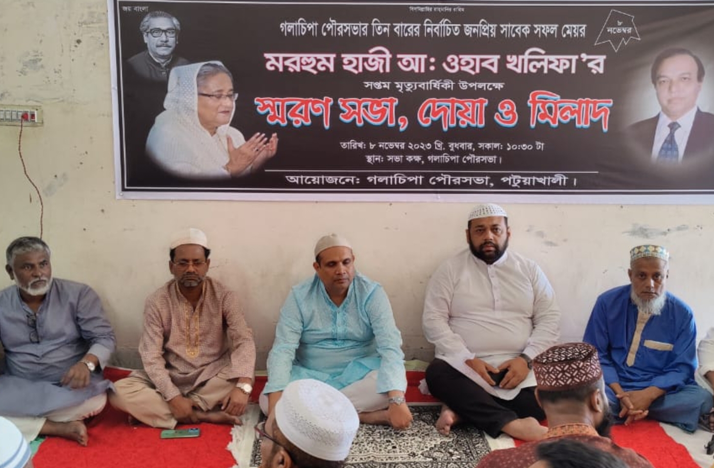 গলাচিপা প্রতিনিধিঃ পটুয়াখালীর গলাচিপায় সাবেক মেয়র হাজী আ. ওহাব খলিফার ৭ম মৃত্যুবার্ষিকী পালিত হয়েছে। হাজী আ. ওহাব খলিফার মৃত্যুবার্ষিকী উপলক্ষে বুধবার (৮ নভেম্বর) বেলা ১১ টায় পৌরসভা কার্যালয়ে তার সুযোগ্য সন্তান বারবার নির্বাচিত পৌর মেয়র ও পৌর আওয়ামী লীগের সভাপতি আহসানুল হক তুহিনের সভাপতিত্বে এক স্মরণসভা ও দোয়া মোনাজাত অনুষ্ঠিত হয়। বাংলাদেশ আওয়ামী লীগের সাবেক সহ-সভাপতি, সাবেক ছাত্রলীগ নেতা ও ২০০৬ সাল থেকে গলাচিপা পৌরসভার ৩ বার নির্বাচিত মেয়র, জনমানুষের নেতা ছিলেন হাজী অ. ওহাব খলিফা।