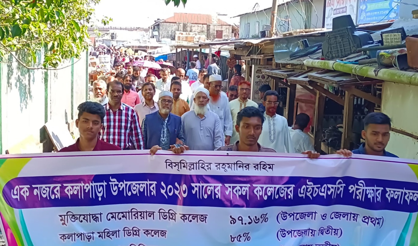 কলাপাড়া প্রতিনিধি: পটুয়াখালীর কলাপাড়ায় মুক্তিযোদ্ধা মেমোরিয়াল ডিগ্রি কলেজ এবারের এইচ,এস,সি’র ফলাফলে জেলায় শীর্ষ অবস্থানে থাকায় সোমবার বেলা ১১টার দিকে কলেজের শিক্ষক, শিক্ষার্থী ও অভিভাবকরা মহিপুরে এক আনন্দ র্যালী করেছে। র্যালীটি কলেজ ক্যাম্পাস থেকে বের হয়ে মহিপুর বাজার প্রদক্ষিণ করে। শেষে কলেজ মাঠে শিকার্থীদের উদ্দেশ্যে বক্তব্য দেন, অধ্যক্ষ মো.কালিমউল্লাহ, জ্যেষ্ঠ প্রভাষক মো.আনোয়ারুল ইসলাম, শিক্ষার্থী অভিভাবক মো.নুরুল ইসলাম হাওলাদার, শিক্ষক মো.নাসির উদ্দিন প্রমূখ।