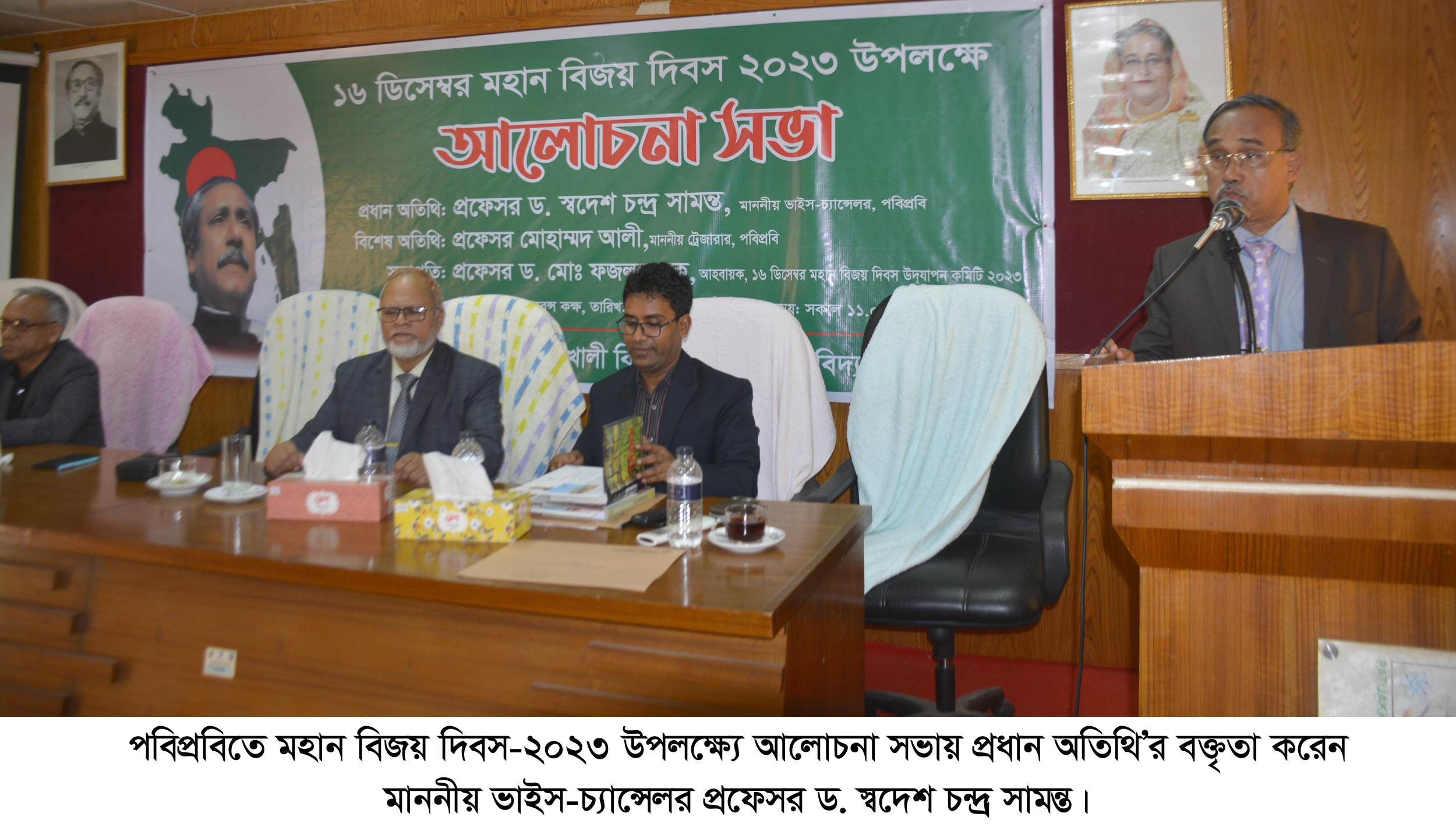 প্রধান অতিথি’র বক্তৃতায় মাননীয় ভাইস-চ্যান্সেলর প্রফেসর ড. স্বদেশ চন্দ্র সামন্ত বলেন, আমাদের মহান বিজয় দিবস, মুক্তিযুদ্ধ ও জাতির পিতা বঙ্গবন্ধু শেখ মুজিবুর রহমানের জীবন দর্শনের আলোকে যে বাংলাদেশ বিনির্মিত হচ্ছে, তার গতিধারাকে যেসব অপশক্তি রুদ্ধ করতে চায়, তাদের রুখে দেওয়া বিজয় দিবসে আমাদের প্রত্যয় হওয়া উচিত। জাতির পিতা বঙ্গবন্ধু শেখ মুজিবুর রহমান যে অসাম্প্রদায়িক মানবিক মূল্যবোধ ধারণ করতেন, সেই মূল্যবোধে আমাদের নতুন প্রজন্ম গভীরভাবে উজ্জীবিত এবং অনুপ্রাণিত যা স্বাধীনতার অর্ধশতাব্দী পেরিয়ে এটি আমাদের অন্যতম একটি বড় অর্জন। বর্তমান সরকারের মিশন ভিশন তথা আধুনিক প্রযুক্তি এবং স্মার্ট বাংলাদেশ বিনির্মাণে মাননীয় প্রধানমন্ত্রী জননেত্রী শেখ হাসিনার নির্দেশনা পালনের জন্য আমাদের কে ঐক্যবদ্ধভাবে কাজ করে যেতে হবে। সভায় বিশ্ববিদ্যালয়ের শিক্ষক, কর্মকর্তা, ছাত্রছাত্রী ও কর্মচারীবৃন্দ উপস্থিত ছিলেন।