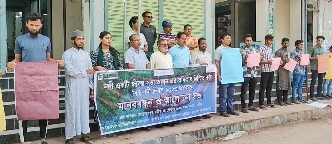 কলাপাড়া প্রতিনিধি: পটুয়াখালীর কলাপাড়ায় বিশ্ব নদী দিবস ২০২৩ পালিত হয়েছে। নদী একটি জীবন্ত সত্তা আসুন এর অধিকার নিশ্চিত করি এ প্রতিপাদ্য বিষয় নিয়ে রবিবার সকাল ১১টায় কলাপাড়া প্রেসক্লাব চত্তরে এ মানববন্ধন অনুষ্ঠিত হয়। ওয়াটার কিপার্স বাংলাদেশ, জাতীয় নদী জোট, কলাপাড়া প্রেসক্লাব ও আমরা কলাপাড়াবাসীর আয়োজনে কলাপাড়া প্রেসক্লাব সাধারন সম্পাদক এস এম মোশাররফ হোসেন মিন্টুর সঞ্চালনায় মানববন্ধনে বক্তব্য রাখেন কলাপাড়া প্রেসক্লাব সভাপতি মোঃ হুমায়ুন কবির, সাংবাদিক ও পরিবেশকর্মী নেছার উদ্দিন আহমেদ টিপু, পরিবেশ কর্মী মোস্তাফিজ জামাল সুজন, ওয়াটার কিপার্স বাংলাদেশ এর কলাপাড়ার সংগঠক কামাল হোসেন রনি প্রমুখ। এসময় বক্তারা জীবন্ত সত্তা নদীকে বাঁচিয়ে রাখার জন্য নদী ভরাট, দখল ও দূষণ মুক্ত রাখার জন্য প্রশাসনের হস্তক্ষেপ কামনা করেন। পরে কলাপাড়া প্রেসক্লাব মিলনায়তনে এক আলোচনা সভা অনুষ্ঠিত হয়।