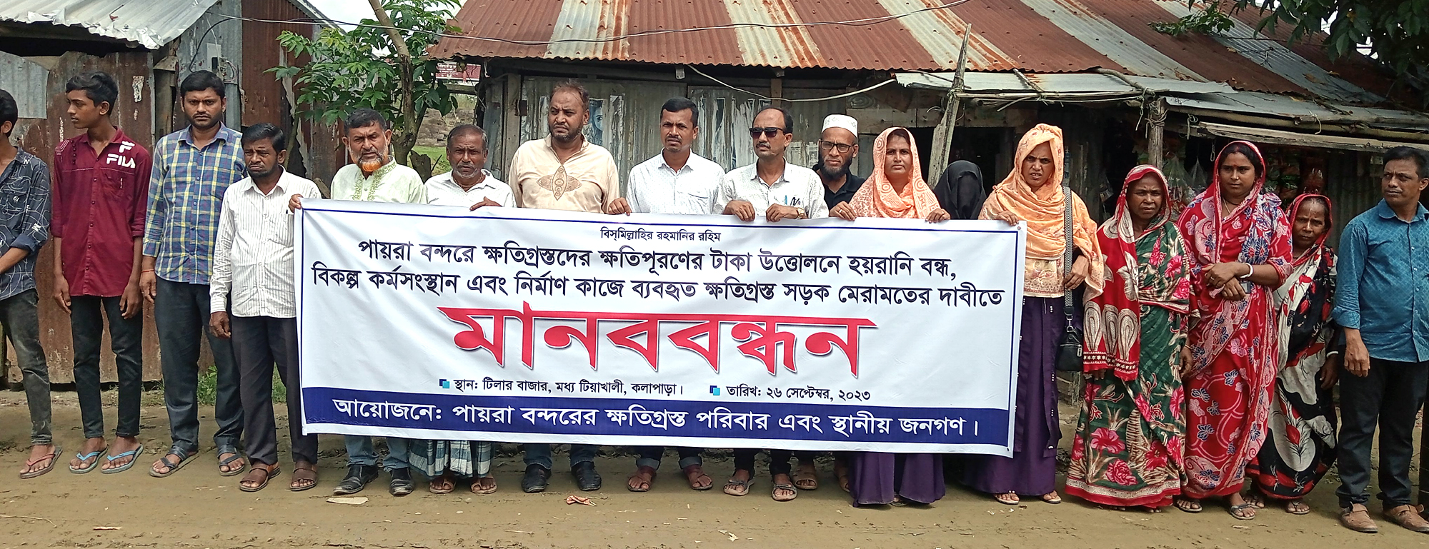 দাবি আদায়ের কর্মসূচিতে পায়রা বন্দরে জমি অধিগ্রহনে ক্ষতিগ্রস্থ মো. কবির তালুকদারের সভাপতিত্বে মানববন্ধনে বক্তব্য রাখেন এ্যাড. মামুন হাওলাদার, ইউপি সদস্য সালমা বেগম, আলহাজ্ব কেরামত হাওলাদার মাধ্যমিক বিদ্যালয়ের প্রধান শিক্ষক জসিম মোল্লা, নজরুল ইসলাম, সোহাগ তালুকদার, ব্যবসায়ী বশির হাওলাদার, হাসান হাওলাদার, নাসির মুন্সি, অটো ড্রাইভার আবুল হাসান মোল্লা, মাহমুদা বুবলী, তাজনাহার বেগম,ঢালী কামরুল ইসলাম, চানমিয়া হাং প্রমুখ।